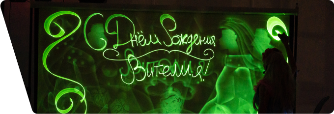 Устройте себе и вашему ребёнку яркое и трогательное шоу. С помощью очаровательной феи вы и ваши гости увидите сказочную историю. Вы и ваш малыш будете её главными героями, представляете! После завершения чудесной истории маленькие гости смогут сами творить чудеса на специальном экране волшебными маркерами, слушая увлекательные рассказы волшебницы.
